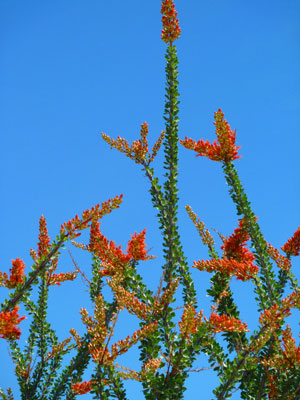Our Ocotillo (ok-oh-teeyo). We have three of these and they are so pretty right now. They're usually not this green, only when blooming the red flowers at the top.